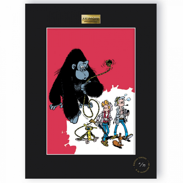This art offset poster derived from Franquin Spirou comic book is printed on a thick art paper Conquéror Connoisseur 100% coton / 300g. Each copy is framed in a black Marie-Louise adorned with an Akimoff Collections pewter plaque. Limited edition and numbered 99 copies. Dimensions: 30x40cm. Le gorille a bonne mine.