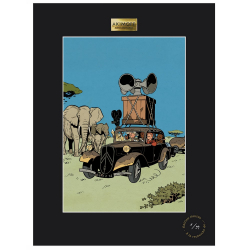 This art offset poster derived from Olivier Schwartz Spirou comic book is printed on a thick art paper Conquéror Connoisseur 100% coton / 315g. Each copy is framed in a black Marie-Louise adorned with an Akimoff Collections pewter plaque. Limited edition and numbered 99 copies. Dimensions: 30x40cm. Kongo Belche.