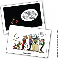 This emblematic Gaston Lagaffe Gift Box 01 contains a cardboard Box, a Booklet M'enfin, a Cube-Gag, a pin, a pin holder, an A3 poster, two postcards and a diorama. All packaged in a sturdy cardboard box. Limited edition of 250 copies.
