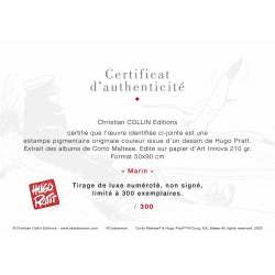 This art offset poster derived from Hugo Pratt Corto Maltese comic book is printed on fine art paper similar to a pigment print. Limited edition of 300 units with numbered certificate of authenticity. 90x50cm. Marine.