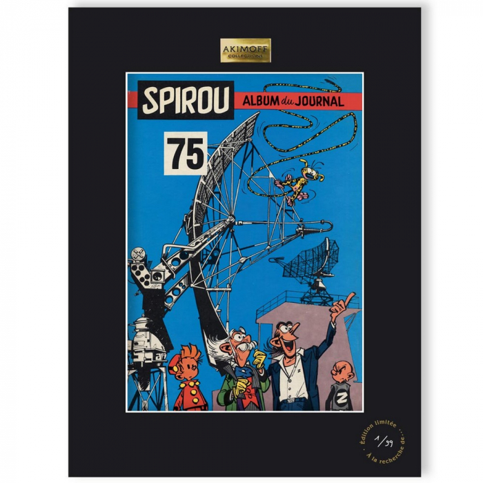 This art offset poster derived from the Spirou & Fantasio comic strip by Franquin at Journal Spirou Cover of the album n°75 - 1960 is printed on a thick art paper Conquéror Connoisseur 100% coton / 315g. Each copy is framed in a black Marie-Louise adorned with an Akimoff Collections pewter plaque. Limited edition and numbered 99 copies. Dimensions: 30x40cm. With Zorglub.