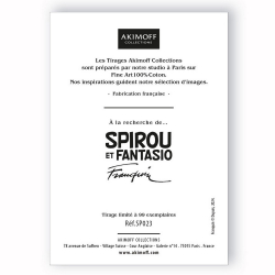 This art offset poster derived from the Spirou & Fantasio comic strip by Franquin at Journal Spirou Cover of the album n°86 - 1962 is printed on a thick art paper Conquéror Connoisseur 100% coton / 315g. Each copy is framed in a black Marie-Louise adorned with an Akimoff Collections pewter plaque. Limited edition and numbered 99 copies. Dimensions: 30x40cm. Giant Marsupilami.