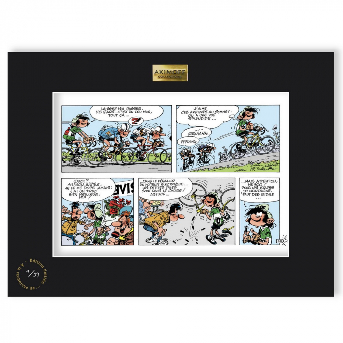 This art offset poster derived from Franquin Gaston Lagaffe comic book is printed on a thick art paper Conquéror Connoisseur 100% coton / 315g. Each copy is framed in a black Marie-Louise adorned with an Akimoff Collections pewter plaque. Limited edition and numbered 99 copies. Dimensions: 40x30cm. Electric bike.