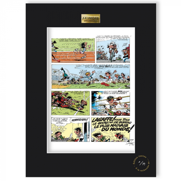This art offset poster derived from Franquin Gaston Lagaffe comic book is printed on a thick art paper Conquéror Connoisseur 100% coton / 315g. Each copy is framed in a black Marie-Louise adorned with an Akimoff Collections pewter plaque. Limited edition and numbered 99 copies. Dimensions: 30x40cm. Dream of champion.