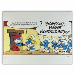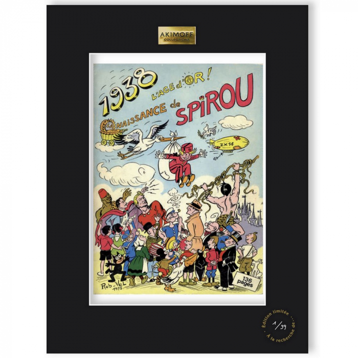 Art offset poster derived from Spirou & Fantasio comic strip created in 1938 by Robert Velter, alias Rob-Vel, at the request of the publisher Jean Dupuis. Printed on a thick art paper Conquéror Connoisseur 100% coton / 315g. Each copy is framed in a black Marie-Louise adorned with an Akimoff Collections pewter plaque. Limited edition and numbered 99 copies. Dimensions: 30x40cm. Birth of Spirou.