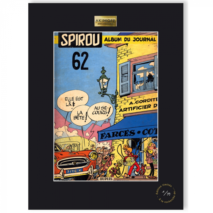 Art offset poster derived from Spirou & Fantasio. Franquin Journal Spirou n°62 - 1957. Printed on a thick art paper Conquéror Connoisseur 100% coton / 315g. Each copy is framed in a black Marie-Louise adorned with an Akimoff Collections pewter plaque. Limited edition and numbered 99 copies. Dimensions: 30x40cm. Farces.