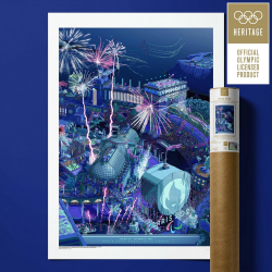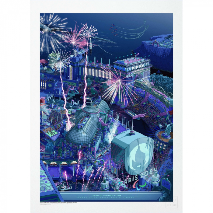 Official licensed product in art edition printed on 220g paper. Frame not provided. Printed in France. Paris 2024 Paralympic Games. Anniversary version, Celebration edition, designed by artist Ugo Gattoni. Dimensions: 50x70cm.