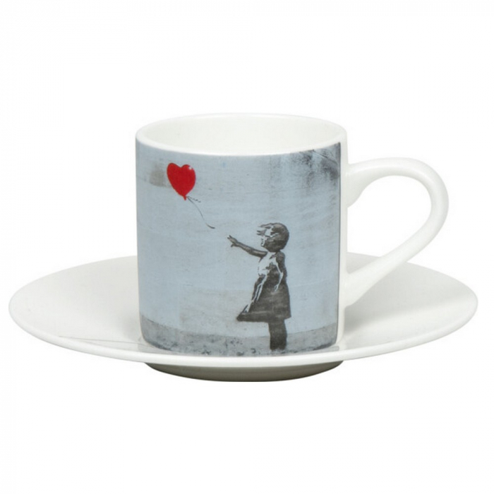 High quality porcelain from the german brand Könitz, Banksy: Girl with Balloon. Ideal for a gift! Compatible with microwave and dishwasher. 95ml. Saucer diameter: 12cm. Cup height: 6cm.