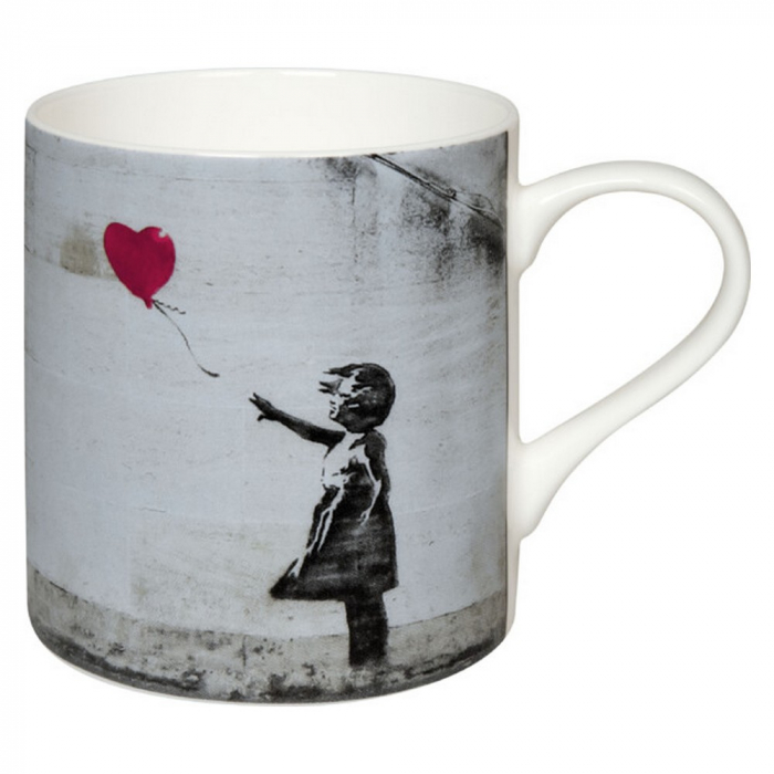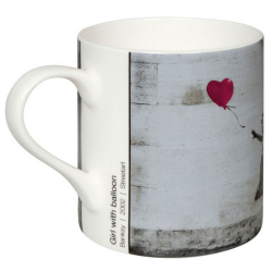 Banksy is the pseudonym of a British street artist who prefers to keep his true identity secret. Few know whether Banksy is a woman, a man, or part of a collective. This hand-decorated bone china mug features one of Banksy's most famous graffiti pieces. Girl with a Balloon is located in London and was created around 2002.