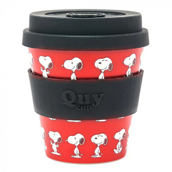 Take away coffee mug Peanuts, Snoopy: Red. Made of food-safe R-PET (recycled PET). Patented QuyCup drip-free lid and soft, anti-scald silicone band. Perfect for hot and cold drinks. Odor and flavor are eliminated (BPA-free). Heat resistant +120°C -20°C. Ideal as a gift, microwave and dishwasher safe. 230ml.