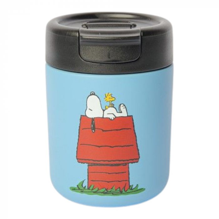 QuyCup Take away thermal mug Peanuts: Snoopy taking a nap. Made of double-walled 304 stainless steel. Keeps drinks hot for 12 hours and cold for 24 hours. BPA-free. Airtight lid. Not suitable for dishwashers or microwaves. 350ml.