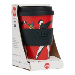 Take away coffee mug Banksy: The flower thrower. Made of food-safe R-PET (recycled PET). Patented QuyCup drip-free lid and soft, anti-scald silicone band. Perfect for hot and cold drinks. Odor and flavor are eliminated (BPA-free). Heat resistant +120°C -20°C. Ideal as a gift, microwave and dishwasher safe. 400ml.