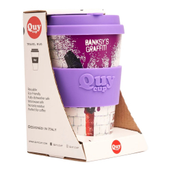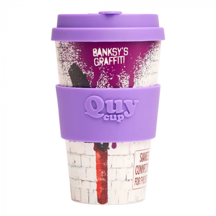 Take away coffee mug Banksy: Hammer Boy. Made of food-safe R-PET (recycled PET). Patented QuyCup drip-free lid and soft, anti-scald silicone band. Perfect for hot and cold drinks. Odor and flavor are eliminated (BPA-free). Heat resistant +120°C -20°C. Ideal as a gift, microwave and dishwasher safe. 400ml.