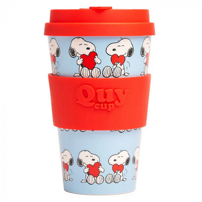 Take away coffee mug Peanuts, Snoopy: Love. Made of food-safe R-PET (recycled PET). Patented QuyCup drip-free lid and soft, anti-scald silicone band. Perfect for hot and cold drinks. Odor and flavor are eliminated (BPA-free). Heat resistant +120°C -20°C. Ideal as a gift, microwave and dishwasher safe. 400ml.