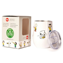 QuyCup Take away thermal stainless steel mug Peanuts, Snoopy: Opera. Made of double-walled 304 stainless steel. Keeps hot drinks hot for 6 hours and cold drinks cold for 12 hours. BPA-free. Lid not airtight. Not suitable for dishwashers or microwaves. 300ml.
