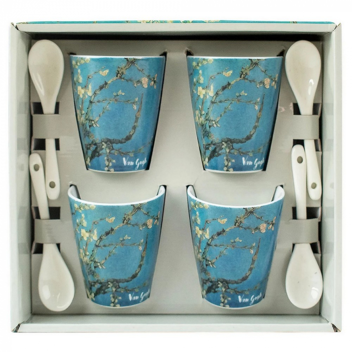 Set of 4 porcelain cups with 4 spoons quality Enesco brand Vincent Van Gogh: Almond Blossoms. Officially licensed product.