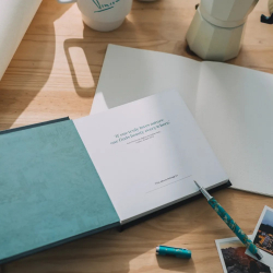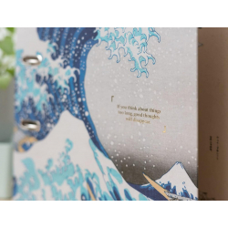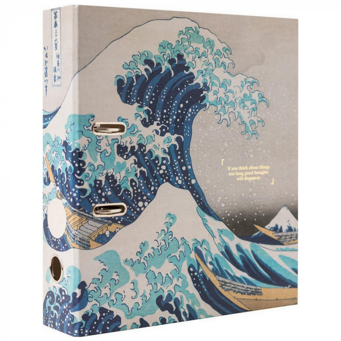 2 rings lever arch folder Erik, Katsushika Hokusai: Wave off Kanagawa. 2mm thick rigid cardboard cover with 150gsm matte paper. Includes a lever arch and metal compressor. A finger loop and label are located on the spine. Customizable interior design. 28x32cm.