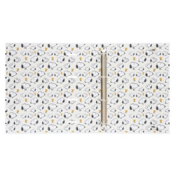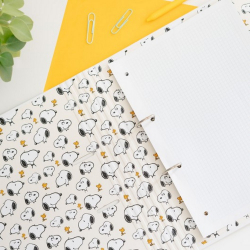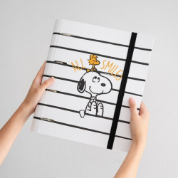 Folder 4 rings with accessories Erik Peanuts, Snoopy: All Smiles. Includes a pack of 100 A4 squared sheets, a clear plastic envelope, 4 polypropylene dividers and a compression bar. Hard cover lined with matte laminated paper. Personalized interior according to the design. Dimensions: 28x32cm.
