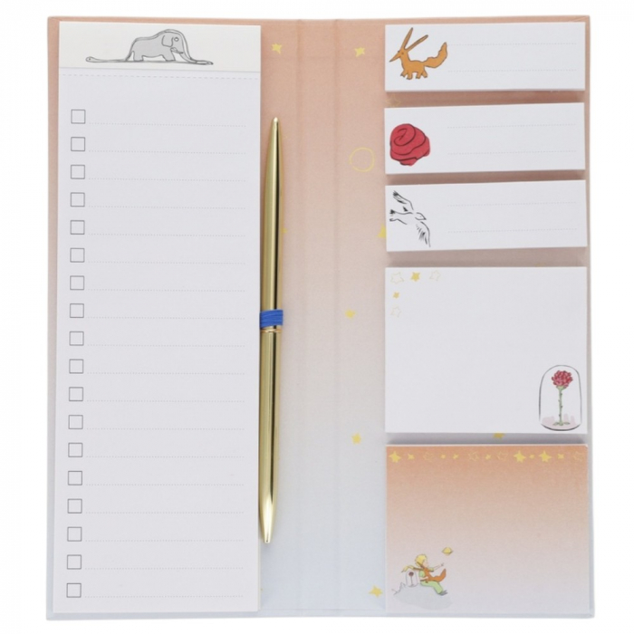Organize your thoughts with this Kiub Sticky Note Pack The Little Prince pointing at the stars. This elegant printed paper set includes a To-do list pad, sticky notes, and a golden pen. Adorned with a poetic gradient and an inspiring quote, it is the ideal desk accessory to combine organization and daily sweetness.