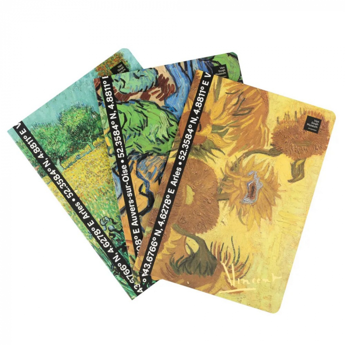 Set of 3 notebooks Erik, Vincent Van Gogh. The 3 notebooks have 32 sheets of 80g, or 64 pages. One notebook is dotted, the other lined and the other with blank pages. Soft cover, with three different designs. Dimensions: 14,8x21cm.