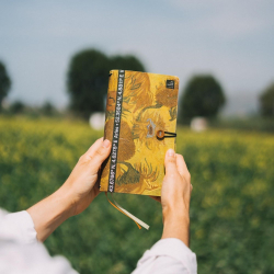 Notebook Erik, Vincent Van Gogh. Soft synthetic leather cover with elastic closure. Features blank, lined, and dotted pages. Custom-designed interior covers. Dimensions: 12,5x21cm.