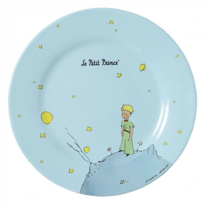 Petit Jour plate, The Little Prince on his planet. A colorful plate for everyday meals, picnics or birthday snacks. It will be appreciated by your little ones for its originality and its design. The plate is flat, suitable for young children. Machine washable. Do not use in the microwave or freezer. Blue color. Material: melanin. Diameter: 23cm.