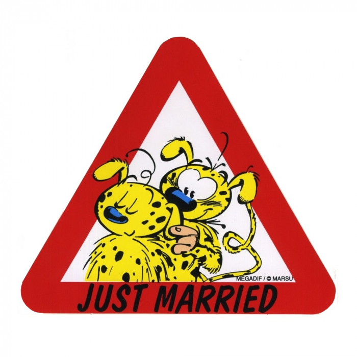 Offset print sticker on self-adhesive glossy paper from the Mégadif brand: Marsupilami, Just Married. Dimensions: 16,5x14,3cm.