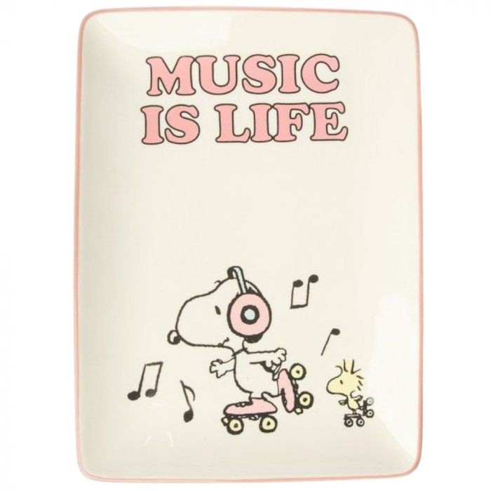 Porcelain Tray Peanuts, Snoopy: Music is life. Crafted from high-quality porcelain with a smooth, glossy finish, this tray is perfect for storing keys, coins, jewelry, or small everyday items. Decorative and functional, it adds personality and a touch of nostalgia to entryways, desks, nightstands, or living rooms. Dimensions: 16x1,6x22cm.