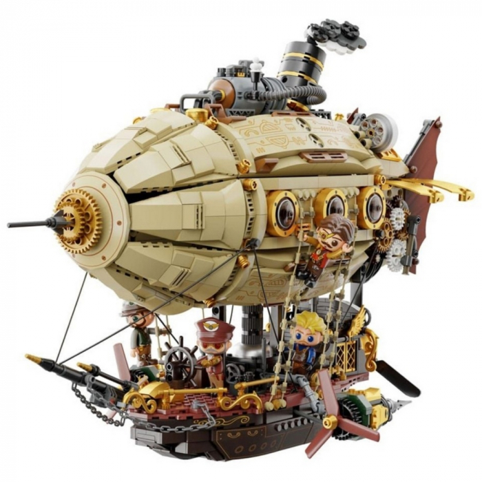 The Steampunk Airship by Pantasy is a fascinating model that combines the classic aesthetics of a Zeppelin with a unique steampunk design. With 1949 individual pieces, this set offers a challenging and enjoyable building experience for creative minds aged 12 and up. The construction features a double-layer design that includes both upper steam chimneys and a lower boiler cabin. The intricate detailing with copper-colored accents, riveted elements, and exposed gears gives the model an authentic industrial charm. Five minifigures are included in the set to spark imagination during play. This model is not just a toy, but also an impressive collector's item that embodies a love for mechanics and the history of aviation.