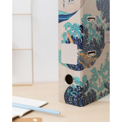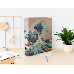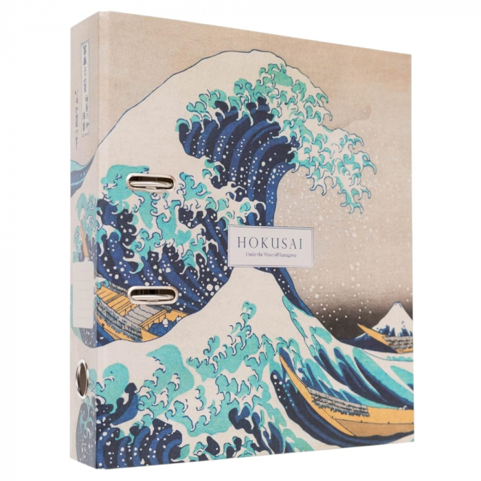 Carpeta de palanca 2 anillas Erik Katsushika Hokusai: Ola de Kanagawa, versión 2. Tapa de cartón rígido de 2 mm de grosor con papel mate de 150 g/m². Incluye un mecanismo de palanca y un compresor metálico. Presilla y etiqueta en el lomo. Diseño interior personalizable. 28x32cm.