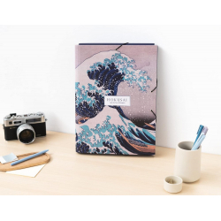 Carpeta solapas Erik Katsushika Hokusai, La gran ola de Kanagawa. Tapa dura forrada con papel laminado en mate. Interior personalizado acorde al diseño. Dimensiones: 25,5x34cm.