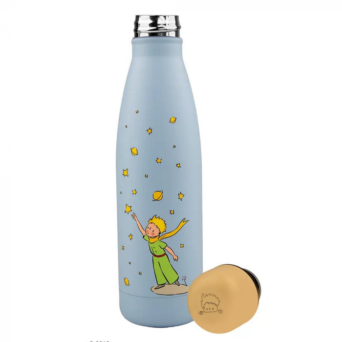 Botella térmica en acero inoxidable El Principito tocando las estrellas. Tapón de rosca sólido y a prueba de fugas. El efecto aislante del material mantiene el liquidó caliente o frío. ¡Sumérgete en el mundo del principito y déjate encantar! 500ml.