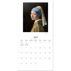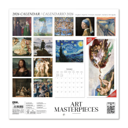 Calendario de pared Erik: Obras maestras del arte 2026. Encuadernación con grapa, incluye 12 imágenes en su interior y agujero de 5mm para colgar en la pared. Incluye poster. Papel de 250g y laminado brillo en la cubierta e interior de 150g. Dimensiones: 30x30cm. 6 idiomas: inglés, español, francés, alemán, italiano y portugués. 12 meses de enero a diciembre de 2026.