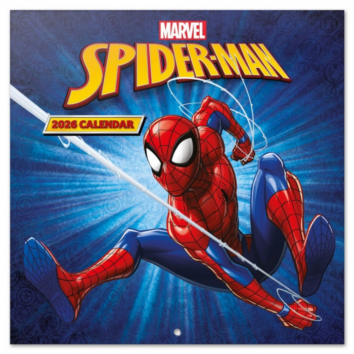 Calendario de pared Erik Spider-Man, 2026. Encuadernación con grapa, incluye 12 imágenes en su interior y agujero de 5mm para colgar en la pared. Incluye poster. Papel de 250g y laminado brillo en la cubierta e interior de 150g. Dimensiones: 30x30cm. 6 idiomas: inglés, español, francés, alemán, italiano y portugués. 12 meses de Enero a Diciembre 2026.