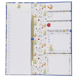 Deje que la poesía de Antoine de Saint-Exupéry inspire sus notas con este magnífico Set de Notas El Principito Azul Liberty, diseñado por el fabricante Kiub. Este completo maletín se presenta en una resistente tapa dura con un diseño azul profundo, salpicado de ilustraciones emblemáticas del Principito, el zorro y la rosa. En su interior, encontrará una disposición práctica para todas sus tareas: un bloc de notas grande tipo To-do list para sus prioridades, varios formatos de notas adhesivas ilustradas para sus recordatorios y un elegante bolígrafo dorado incluido en su soporte elástico. La portada está realzada por la inspiradora cita: Solo se ve bien con el corazón. Lo esencial es invisible a los ojos. Con sus 40 páginas de notas, este set es perfecto para mantenerse organizado con elegancia, ya sea en la oficina o en casa.