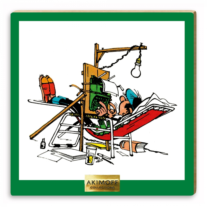 Cuadro de madera de arce del fabricante Akimoff, Franquin Tomás el Gafe: Gastón trabajando. Serie limitada a 59 ejemplares y numerada a mano de 1 a 59. Una inmersión en el corazón del trabajo de Gaston, donde nuestro metepatas está inmerso en sus inventos, siempre buscando el próximo gran avance.
