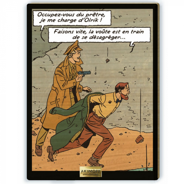 Cuadro de madera de arce del fabricante Akimoff, Blake y Mortimer del álbum Firmado Olrik: Persiguiendo a Olrik de Yves Sente y André Juillard. Las ilustraciones y los colores de este álbum lo convierten en una obra magistral de Ligne Claire, resaltando la elegancia y precisión del estilo que hizo tan famoso a Juillard. Serie limitada a 59 ejemplares y numerada a mano de 1 a 59.