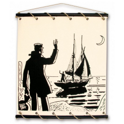 Póster sobre lienzo de algodón Corto Maltés, Despedida. Incluye un cordón para poder colgarlo en la pared. Soporte en madera, la cuerda es de color cáñamo. Entregado en bolsa de lona con el visual del panel. Hecho a mano en Francia. Dimensiones 85x90cm.