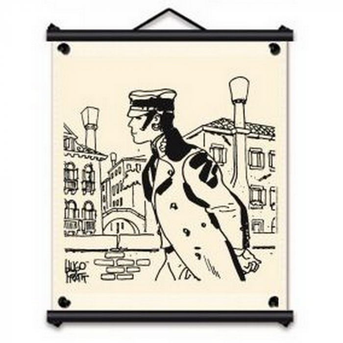 Póster sobre lienzo de algodón Corto Maltés, Cannaregio. Incluye un cordón para poder colgarlo en la pared. Soporte en madera, la cuerda es de color cáñamo. Entregado en bolsa de lona con el visual del panel. Hecho a mano en Francia. Dimensiones 40x45cm.