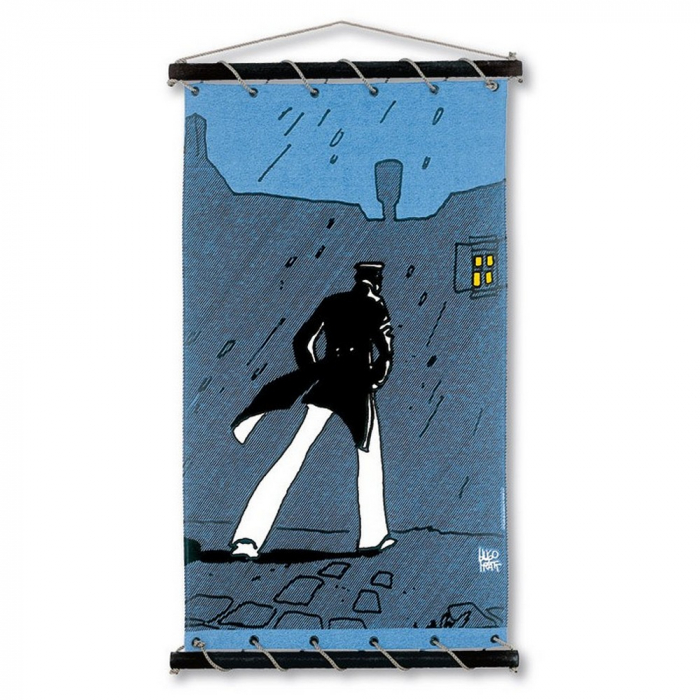 Póster sobre lienzo de algodón Corto Maltés, Venecia. Incluye un cordón para poder colgarlo en la pared. Soporte en madera, la cuerda es de color cáñamo. Entregado en bolsa de lona con el visual del panel. Hecho a mano en Francia. Dimensiones 75x130cm.