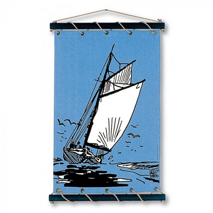 Póster sobre lienzo de algodón Corto Maltés, Viento. Incluye un cordón para poder colgarlo en la pared. Soporte en madera, la cuerda es de color cáñamo. Entregado en bolsa de lona con el visual del panel. Hecho a mano en Francia. Dimensiones 65x100cm.