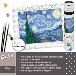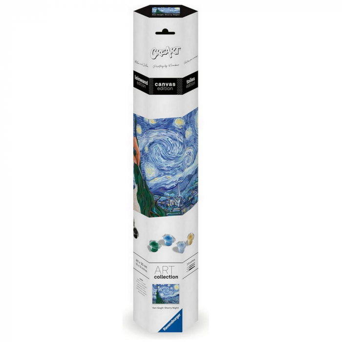 Set de lienzo de pintura por números Ravensburger CreArt, Vincent Van Gogh: Noche Estrellada. ¡Conviértete en artista pintando por números! Pinta paso a paso usando las áreas de pintura numeradas y crea una verdadera obra maestra. ¡Estarás orgulloso de mostrar tu creación! 40x30cm.
