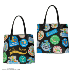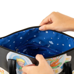Bolso El Principito: since 1943. Su color oscuro se realza con una serie de vibrantes ilustraciones, que celebran momentos icónicos y citas de esta entrañable historia. Su espacioso interior espacio para tus objetos esenciales de diario, manteniendo un estilo elegante. Cierre de cremallera. Dimensiones: 32x11x34cm.