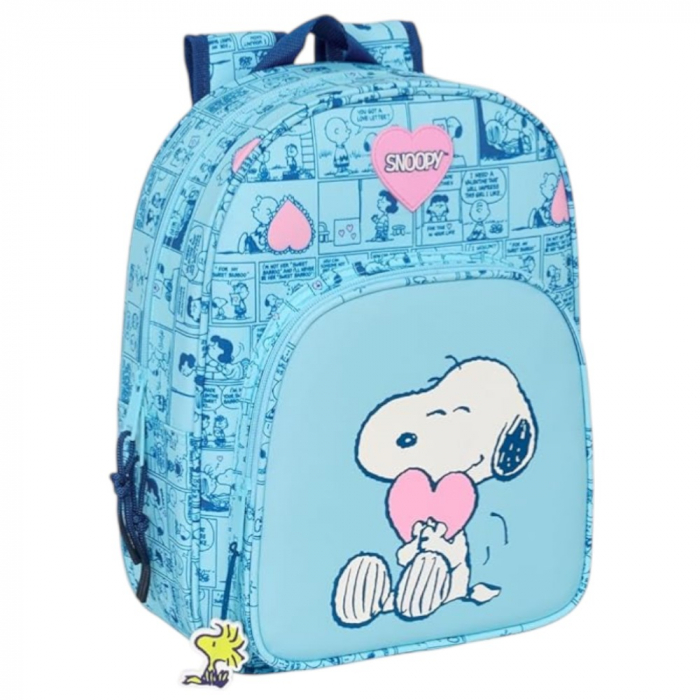Mochila adaptable a carrito Safta Peanuts Snoopy: Corazón. Cuenta con un bolsillo frontal de gran formato y un bolsillo lateral portabotellas. Incluye hombreras ergonómicas y acolchadas para mayor comodidad. Dimensiones: 32x12x38cm.