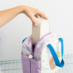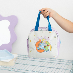 Fiambrera Isotérmica Erik El Principito: El Principito y el Zorro durmiendo. El interior es de aluminio mientras que el exterior es poliéster. Esto mantendrá la comida fría o caliente. Dispone de cremallera, bolsillo lateral y asa de tela para facilitar su transporte. Dimensiones: 20x20cm.