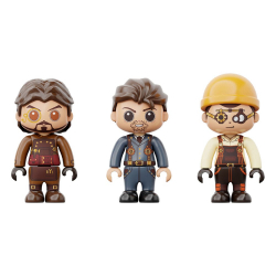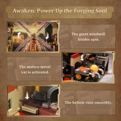 Pero el verdadero placer reside en el interior. El molino revela varias salas de trabajo: una forja con brasas brillantes, una mesa de diseño llena de planos secretos, máquinas herramienta e incluso un brazo articulado listo para crear lo imposible. Todo rezuma ingenio y pasión por el detalle. Las tres figuras incluidas, cada una con su peculiar aspecto de manitas, añaden un irresistible toque narrativo.