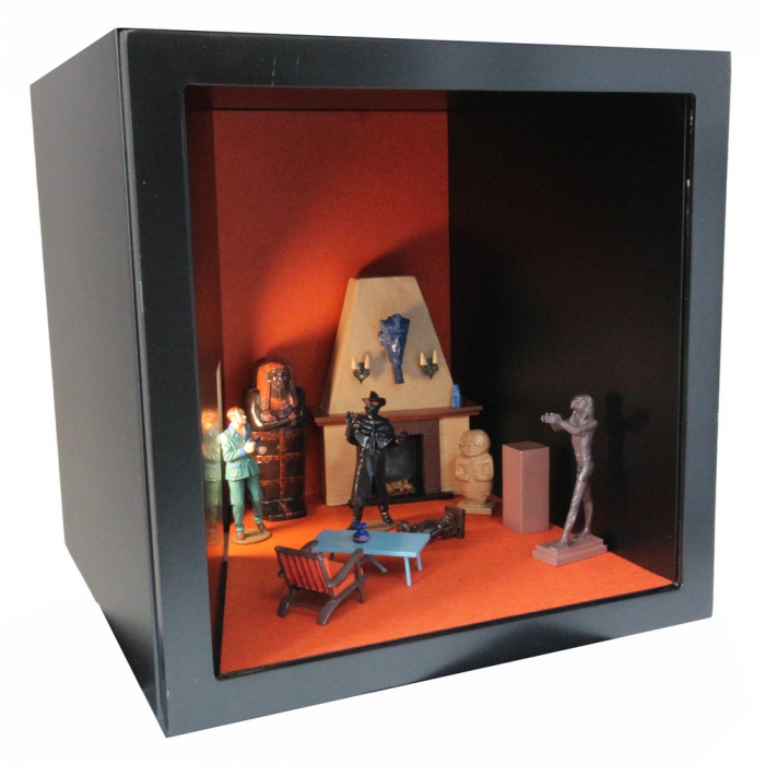 Cubo decorativo con figura de metal colección Pixi Pixirama Blake y Mortimer: Mortimer desenmascarando. Esculpidas y pintadas a mano, las figuras de Pixi son auténticas piezas de colección. Edición limitada y numerada a 200 unidades con certificado de autenticidad. Dimensiones del cubo de madera lacada: 22,5x22,5x22,5cm.
