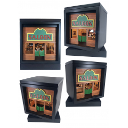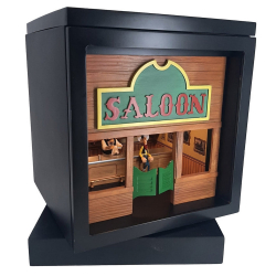 Cubo decorativo con figura de metal colección Pixi Pixirama Lucky Luke Mortimer: el saloon. Esculpidas y pintadas a mano, las figuras de Pixi son auténticas piezas de colección. Edición limitada y numerada a 150 unidades con certificado de autenticidad. Dimensiones del cubo de madera lacada: 22,5x22,5x22,5cm.