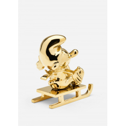 Figurita de colección Skultuna de Las aventuras de los Pitufos: Pitufo en el trineo. Acero 316L de alta calidad bañado en oro. Altura: 5,5cm.