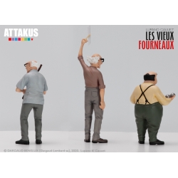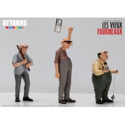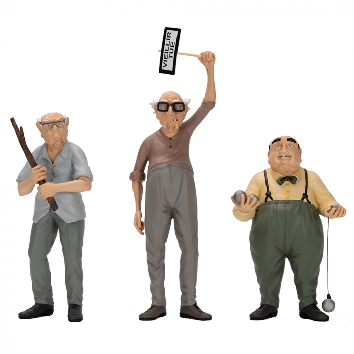 Cofre con tres figuras de colección en resina Attakus, Los viejos hornos: Antoine, Émile y Pierrot. Edición limitada y numerada a 600 unidades con certificado de autenticidad firmado a mano por Lupano y Cauuet. Altura: 11,5cm.